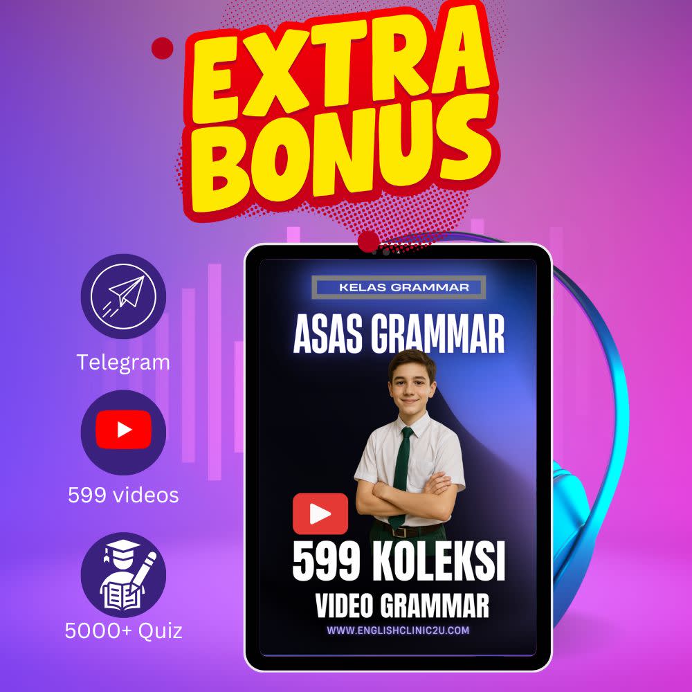 Akses 599 Video Grammar Lengkap (Basic → Advanced) Sistem pembelajaran tersusun untuk bantu anda faham, kuasai dan terus apply dalam exam. Scan barcode di belakang buku untuk unlock semua video pembelajaran.